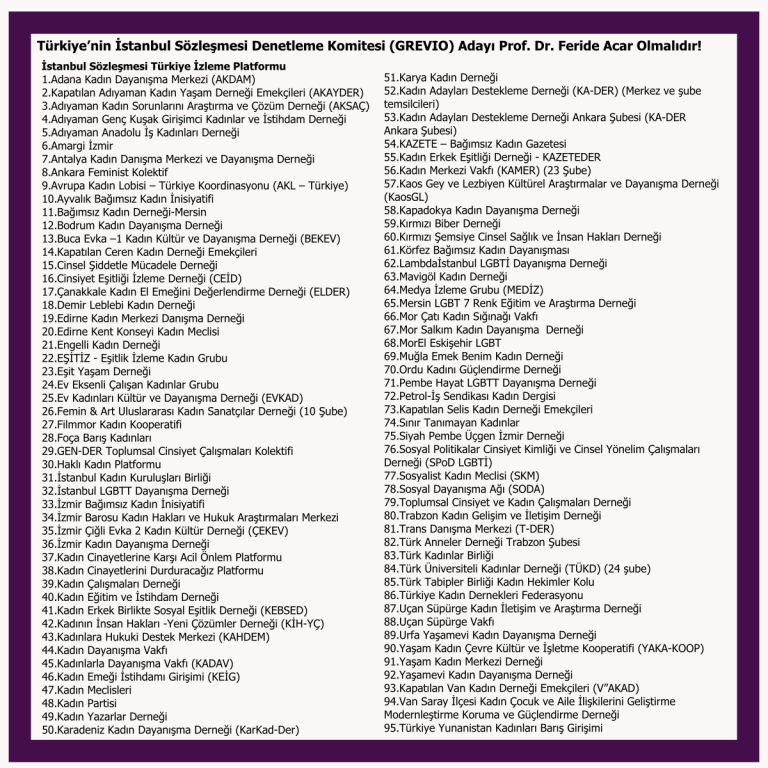 Kadın ve LGBTİ+ Örgütlerinden Çağrı: Türkiye’nin İstanbul Sözleşmesi Denetleme Komitesi (GREVIO) Adayı Prof. Dr. Feride Acar Olmalıdır!